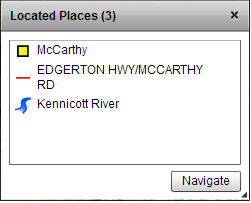 When you find a place, the map will pan/zoom to its location and it will be listed in the Located Places panel. The Located Places panel appears the